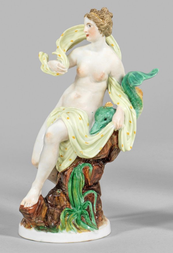 Auf einem Felsen sitzende Amphitrite als Halbakt mit Goldreif und einem zartgelben, vom Wind bewegtem Tuch. Seitlich ein Delphin als ihr Attribut. Polychrome Malerei. Zepter- und Malereimarke. Entw. W. Chr. Meyer. Unw. rest.; Zeptermarke. H. 18,5 cm.