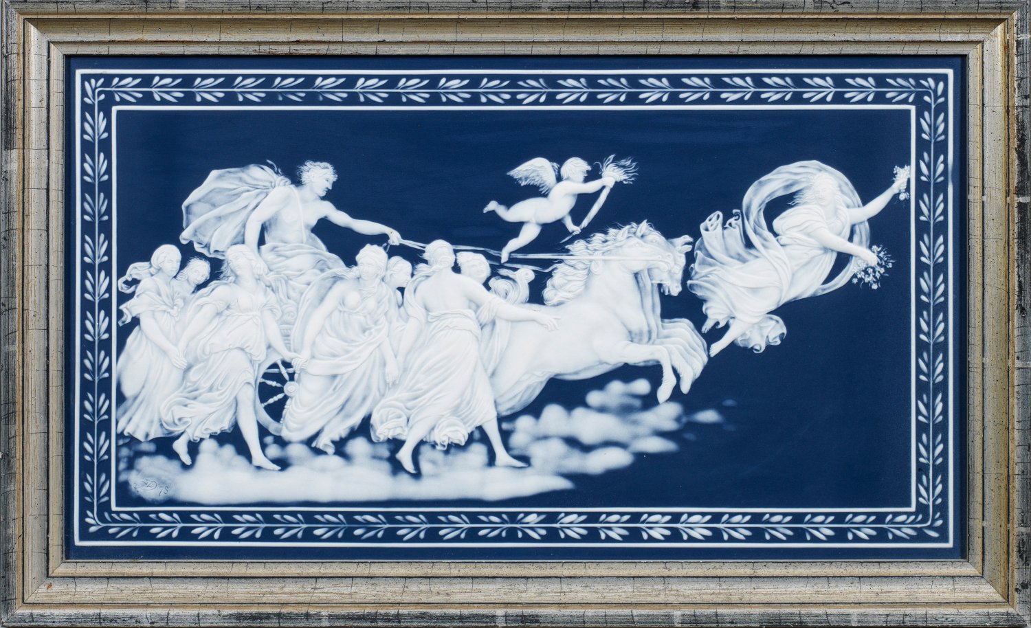 Panolith-Steinzeug. Rechteckige Form. Im Sonnenwagen sitzender Apollo mit Gefolge und schwebendem Putto, der Göttin Aurora folgend, nach Guido Reni. Flach reliefiertes Pâte-sur-Pâte in Weiß auf blauem Grund. In der Art der Wedgwood-Jasperware. Links unten monogr. und dat. (19)78. Limitierte Aufl. Nr. 3/5000. Rücks. Wandaufhängung. Profilierter Holzrahmen. Manufakturmarke. Plattenmaß 30 cm x 53 cm. 35,5 cm x 58,5 cm.