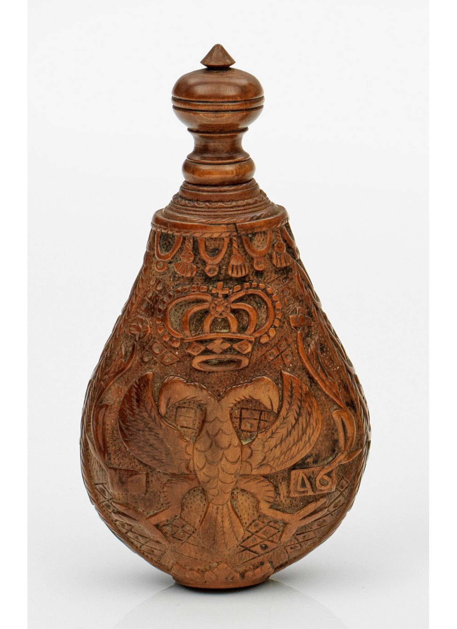Buchsbaum, geschnitzt. Birnförmiger Korpus, umlaufend dekoriert mit geflochtenen Ornamentbändern, Kordeln und üppigem Reliefdekor. Schauseitig ein bekrönter Doppeladler flankiert von rechteckigen Kartuschen mit Dat. sowie ein Wappen mit floraler Helmzier. Auf dem Wappenschild dargestellt drei auf einem Fluss schwimmende Enten. Darunter monogr. "E. D". Balusterförmig gedrechselter, mehrfach von Zierlinien profilierter Stopfen. H. 12 cm. 6,5 cm x 3 cm.