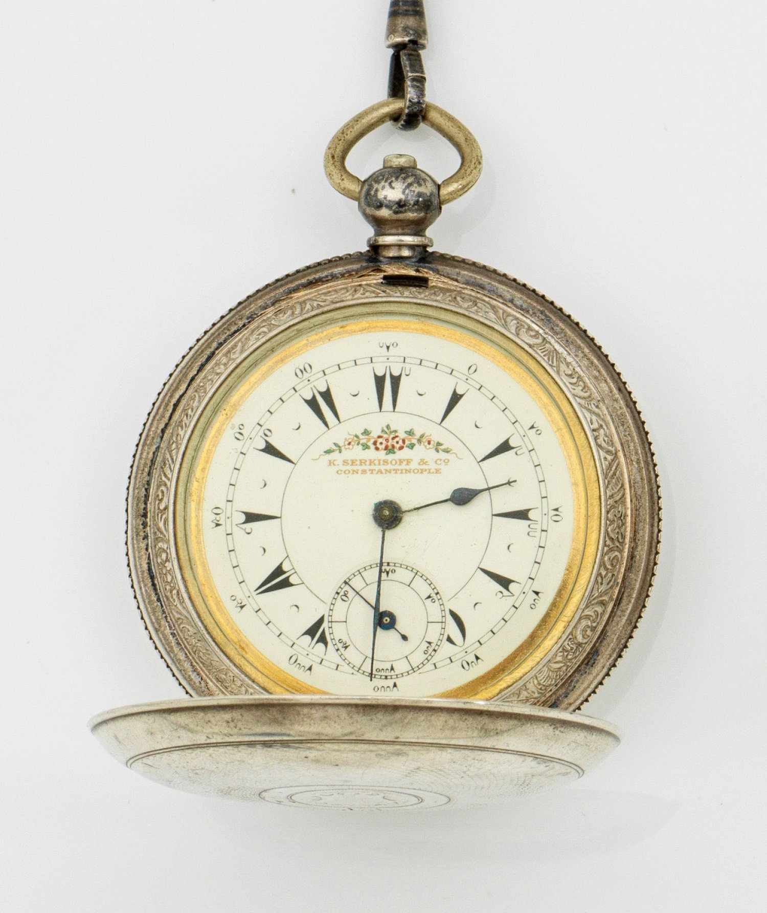 Schweiz. Um 1900. Silber, gest. 800. Guillochiertes Savonettegehäuse. Glatte Silbercuvette. Emailzifferblatt mit Osmanischen Keilziffern, kleiner Sekunde, gebläuten birnförmigen Zeigern und Signet "K. Serkisoff & Co. Constantinople". Vergoldetes Brückenwerk mit Kompensationsunruh und Ankerhemmung. Platine sign.; Uhrenkette mit Schlüssel. Gew. ca. 124,6 g. D. 5,5 cm.