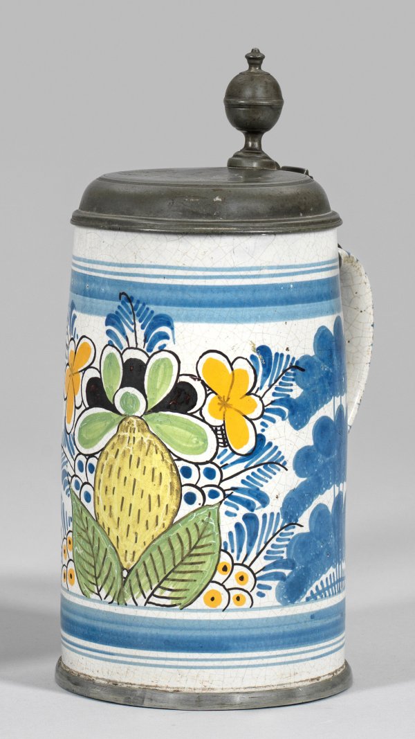 Fayence. Polychromer Scharffeuerdekor mit stilisierten Früchten, Fliederblättern und Blüten, flankiert von Bäumen. Haarrisse; Zinnmontierung, Deckel mit graviertem Monogramm und Dat. 1778. H. 25 cm.
