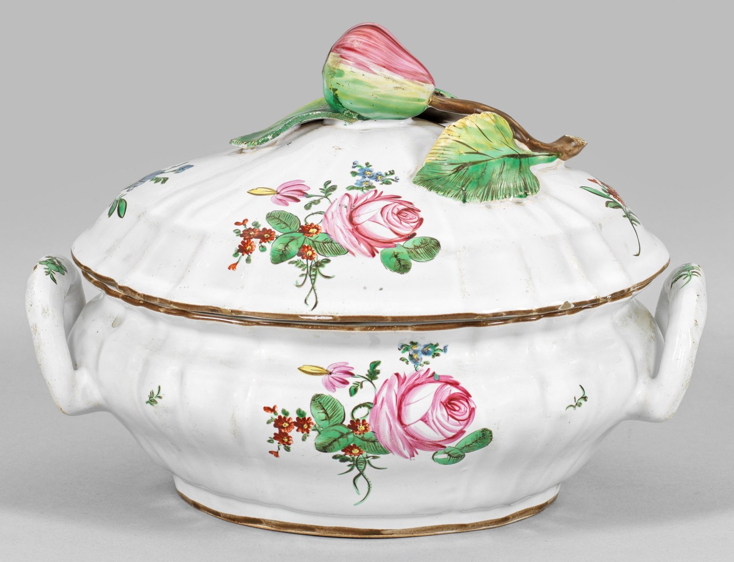 Ovale, godronierte Form mit zwei seitlichen, hochgezogenen Griffen. Gewölbter Deckel, als Knauf ein plastischer Birnenzweig. Polychrom staffiert und bemalt mit kleinen Blumenbuketts und Blumenstängeln. Ger. best.; Manufakturmarke "P". H. 15,5 cm. L. 22,5 cm.