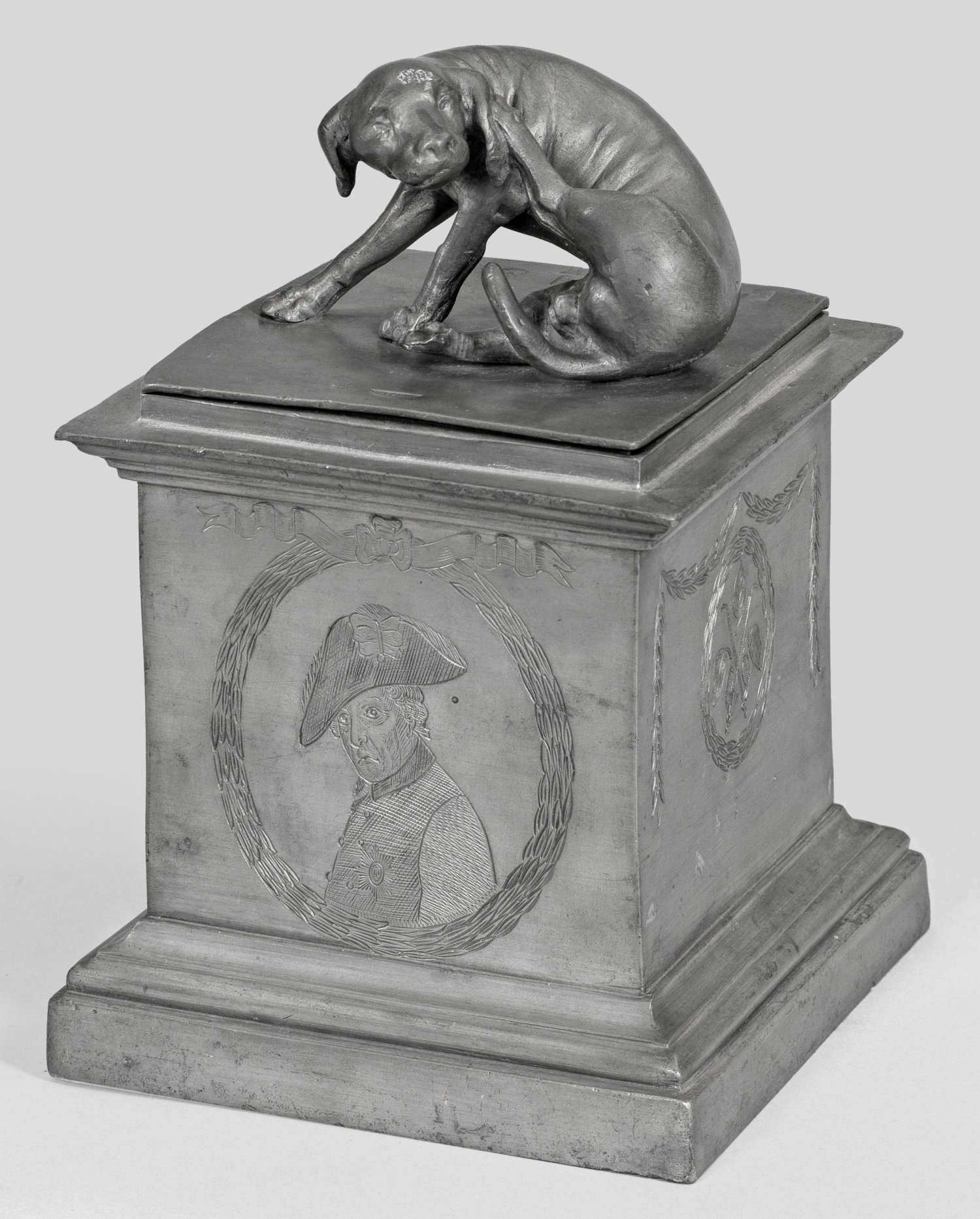 Zinn. Würfelförmiger Korpus mit ausgestellter, stark profilierter Sockel- und Mündungszone. Flacher, quadratischer Deckel mit vollplastischer Darstellung eines sich kratzenden Hundes nach einem Nürnberger Renaissancevorbild. Auf der Wandung graviert und von Lorbeerkränzen gerahmt, ein Brustbild sowie das Monogramm Friedrichs II. von Preußen bzw. im Oval zwei gekreuzte Tabakpfeifen und ein von üppiger Helmzier gerahmtes Besitzerwappen, monogr. und dat. "A.V.v.M. 1796". Auf dem Deckel dreifaches, unbekanntes Meisterzeichen mit einer Rose und schreitendem Löwen. H. 19 cm. 13 cm x 13 cm.