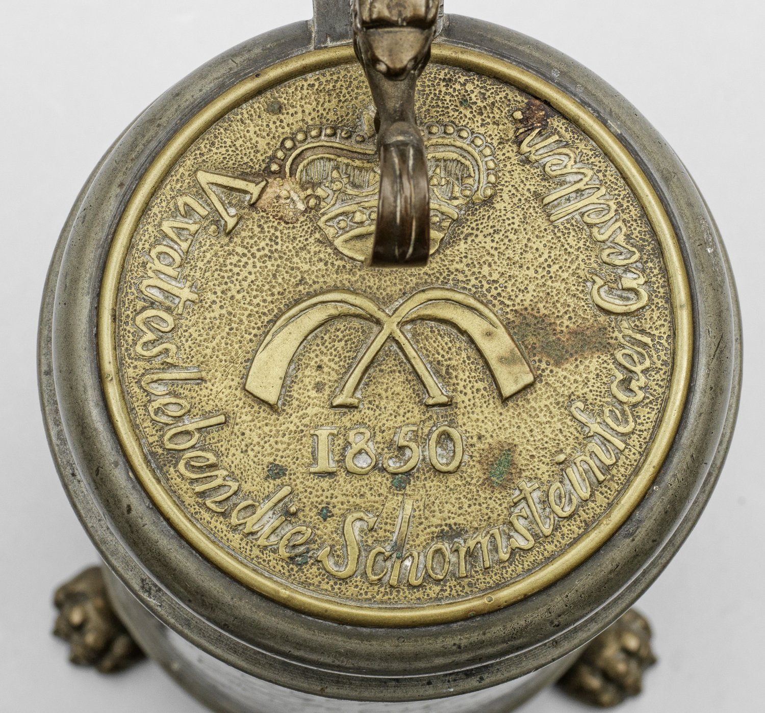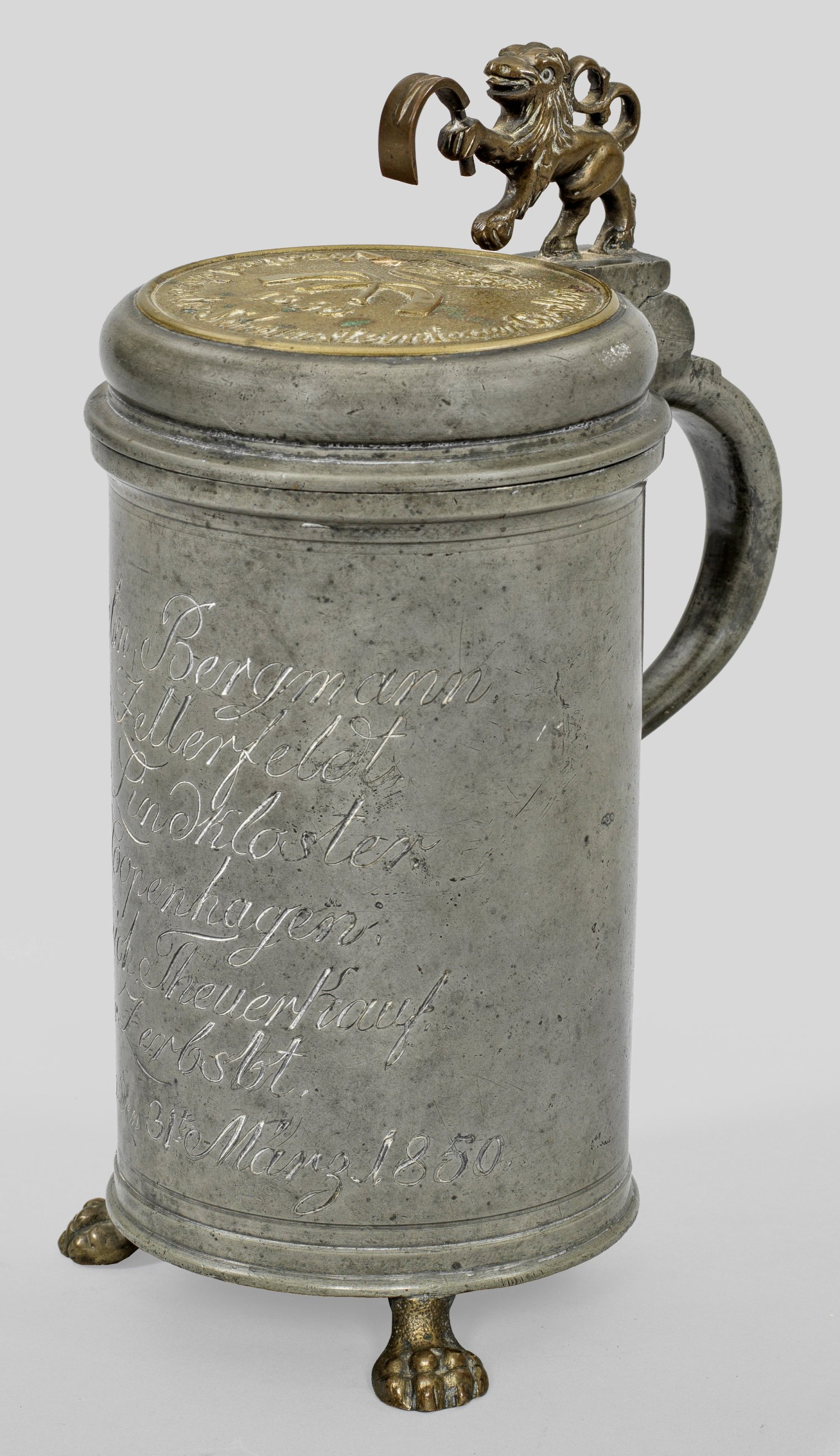 Zinn und Messing. Von drei plastischen Tatzenfüßen getragener, zylindrischer, glatter Korpus mit gering ausgestelltem Rand. Aufgewölbter Scharnierdeckel mit eingelassener Messingplakette. Darauf die bekrönte Darstellung von zwei überkreuzten, sog. Schultereisen, dem traditionellen Werkzeug der Schornsteinfeger. Umlaufender Schriftzug " Vivates leben die Schornsteinfeger Gesellen" sowie dat. "1850". Die Daumenrast vollplastisch in Gestalt eines Löwen, ein Schultereisen haltend, seitlich in ohrenförmigen Bandhenkel übergehend. Auf der Wandung graviert bez. "Wilhelm Bergmann aus Zellerfeldt, Peter Lindkloster aus Copenhagen, Friedrich Theuerkauf aus Zerbst" sowie "Gifhorn den 31. März 1850". Bodeninnenseite teilw. undeutl. gem. "G. W. Storbeck. A. Lüneburg...(?)". H. 27 cm.