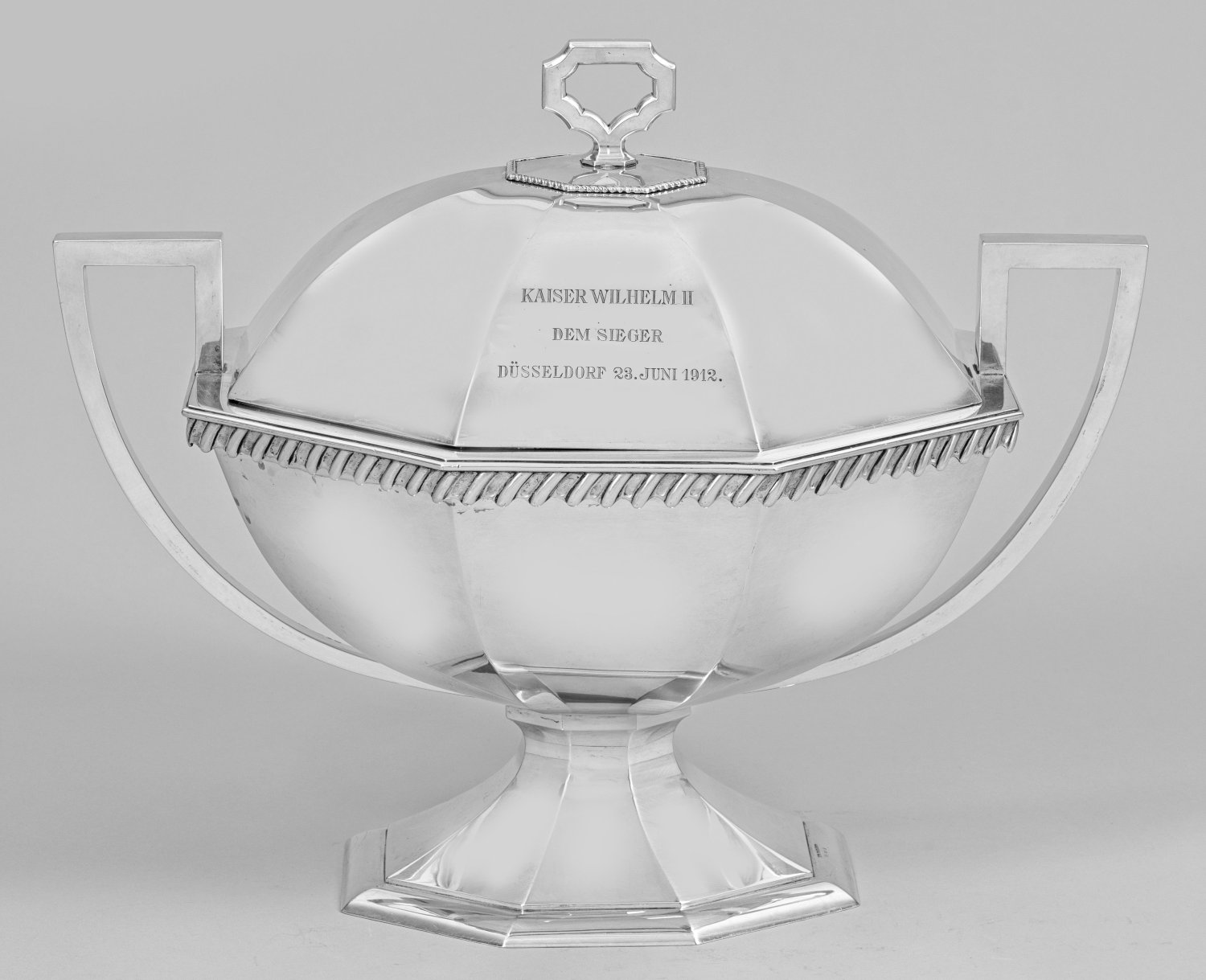 Silber. Ovoider, profilierter und ansteigender Stand mit kurzem, stark eingezogenem Schaft, übergehend in gebauchten, weit ausschwingenden, glatten Korpus. Bombierter Steckdeckel bekrönt von gekantetem Henkelgriff. Stand, Kuppa und Deckel achtfach breit facettiert. Der Korpusrand umzogen von Godronenband. Seitlich zwei hoch aufsteigende, gekantete Henkel. Der Deckel schauseitig graviert mit Widmungsinschrift "KAISER WILHELM II DEM SIEGER DÜSSELDORF 23. JUNI 1912.". Innen vergoldet. Gest. 800, Herstellerzeichen, Händlermarke. Gew. ca. 4275 g. H. 41,5 cm. 50,5 cm x 23 cm.