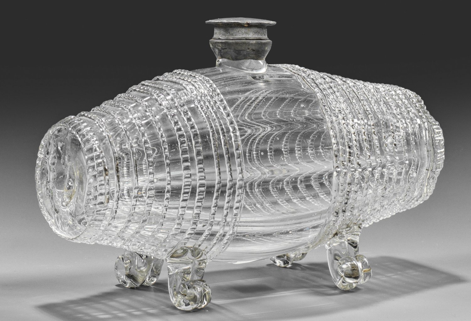 Farbloses Glas. Auf vier volutierten Füßen längliches, längsoptisch geblasenes Fass mit feinen, gekniffenen Fadenauflagen, seitlich Abrissspuren. Zinnmontierung mit Schraubverschluss. H. 12 cm; L. 19,5 cm.