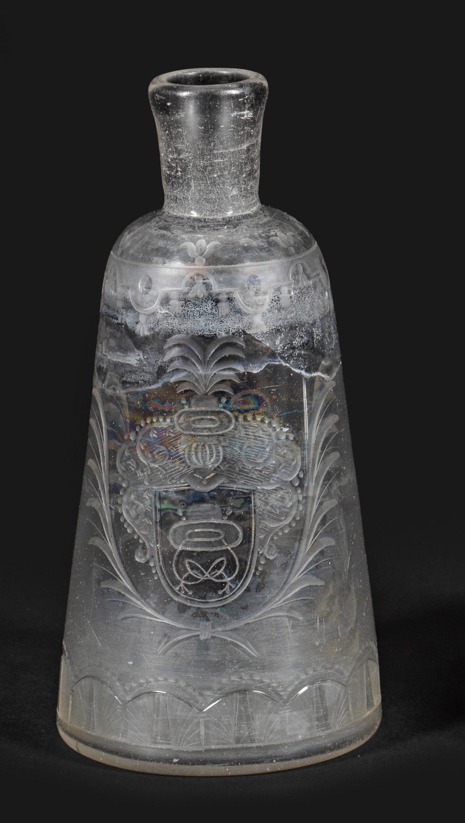 A Potsdam engraved glass bottle with coat of arms of the noble family von Dobeneck and monogram. Tarnished to some areas.