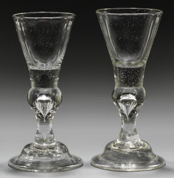 Farbloses Glas. Glockenfuß mit teilw. ausgeschliffenem Abriss und umgeschlagenem Rand, im Balusterschaft eine eingestochene Luftblase. Ein Pokal mit Löwenmarke. H. 18 cm - 18,5 cm.