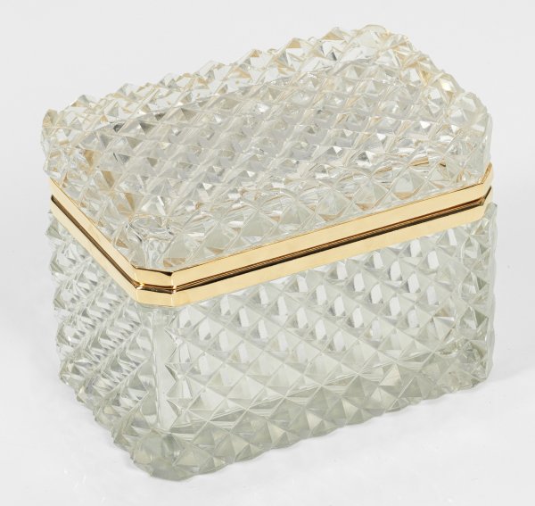 A French Art Deco glass box with diamond pattern and brass-mounted hinged cover.