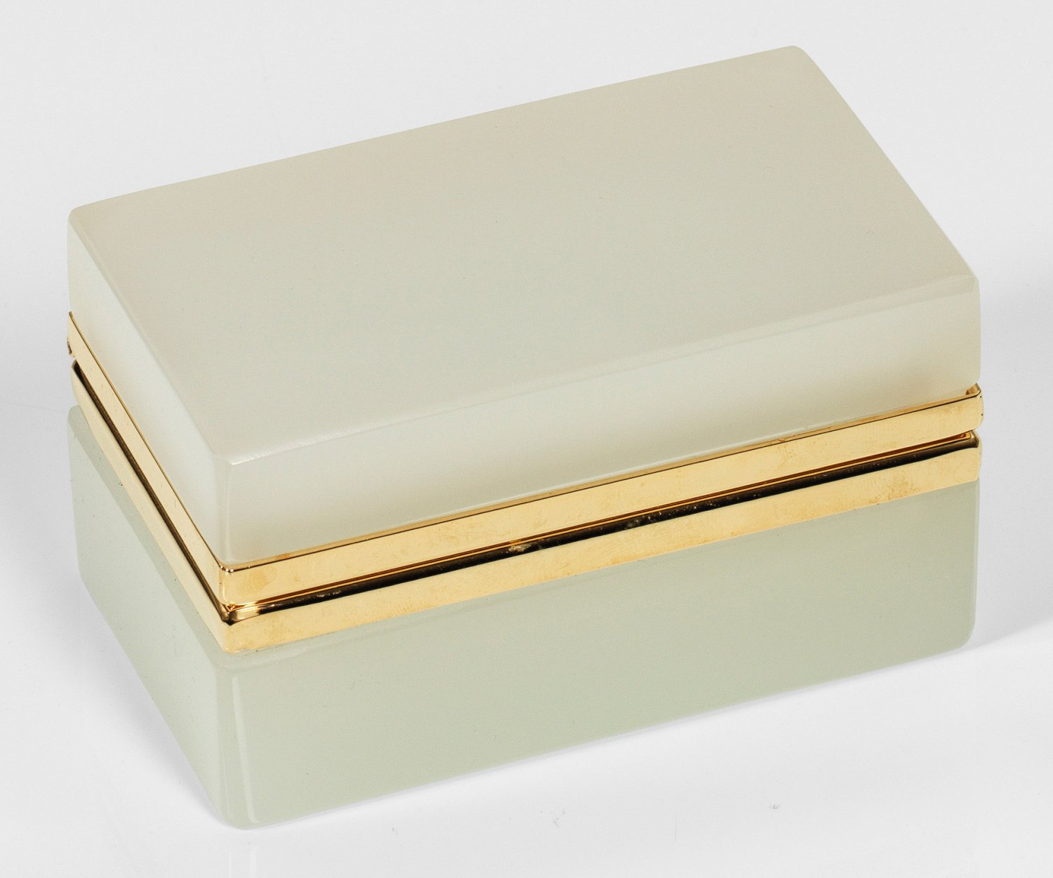 A French Art Deco cut and polished white opalescent glass box with brass-mounted hinged cover.