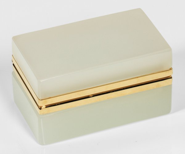 Quaderform. Geschliffenes und poliertes, weißes, opaleszentes Glas. Scharnierte Messingmontierung. H. 6,2 cm, 11 cm x 6,5 cm.