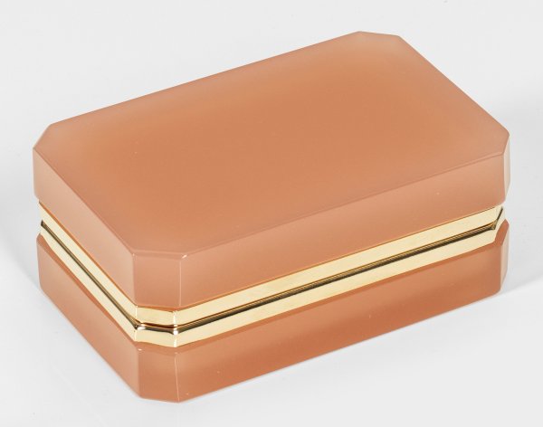 Quaderform, abgeschrägte Ecken. Geschliffenes und poliertes, rosa- bzw. apricotfarbenes, opaleszentes Glas. Scharnierte Messingmontierung. H. 5,5 cm, 13,3 cm x 8,6 cm.