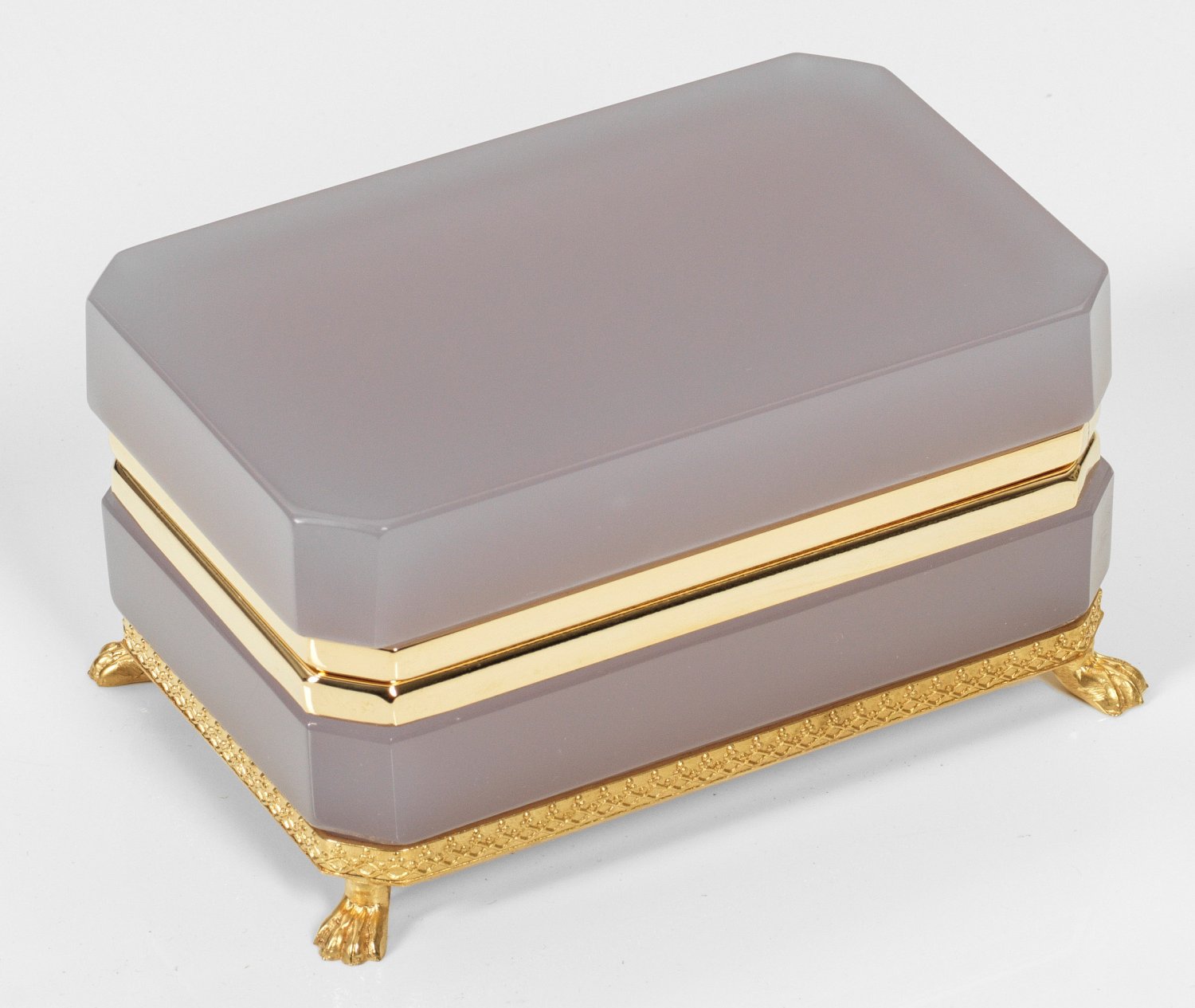 Quaderform, abgeschrägte Ecken. Geschliffenes und poliertes, seladongrünes bzw. rosafarbenes, opaleszentes Alexandrit-/Neodym-Glas. Scharnierte Messingmontierung, Tatzenfüße. H. 7,3 cm, 13,4 cm x 8,7 cm.