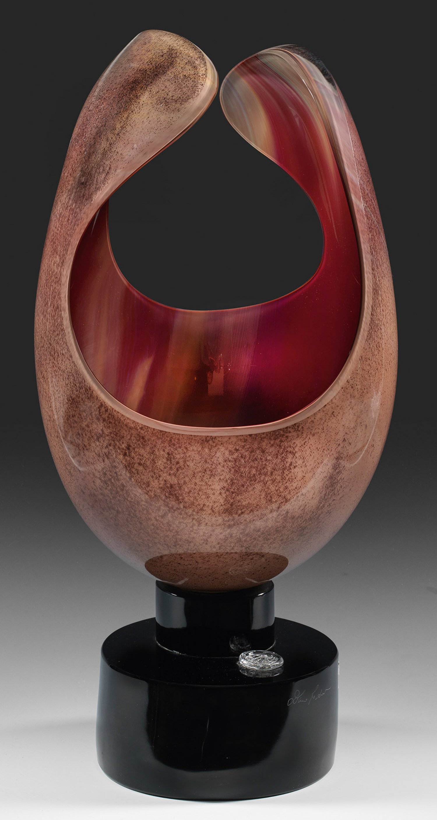 Ovoide, organische, durch asymmetrische Einschnitte gestaltete Form aus Calcedonia-Glas. Schwarzer, abgetreppter Glassockel, zylindrisch bzw. oval und konzentrisch versetzt. Sign. sowie aufgelegte Marke und Studio-Etikett. H, 63,5 cm.