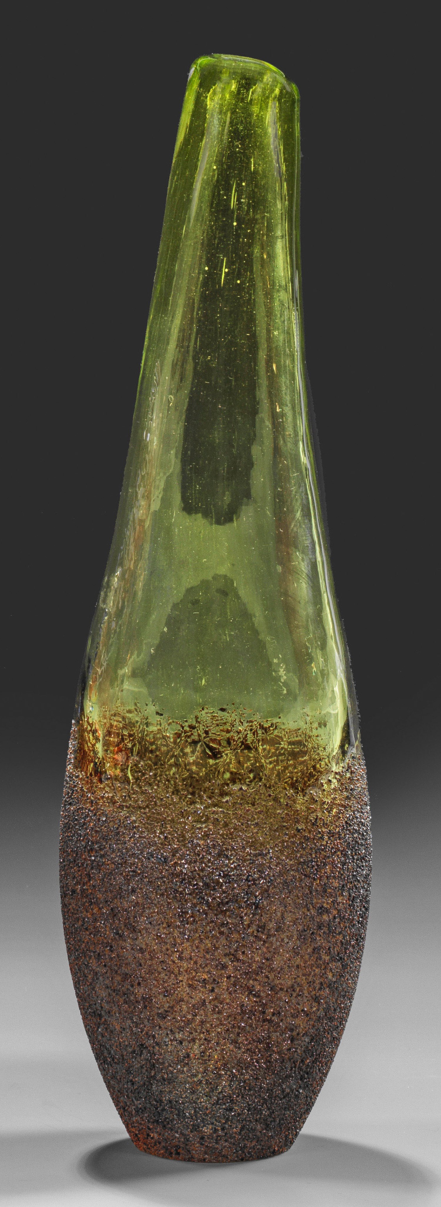 Asymmetrische Keulenform mit enger Öffnung. Hellgrünes Glas, unterhalb raue, dunkelbraune Aufschmelzungen. Modell-Nr. 40036, Entw. Monica Backström (1939 - 2020), 2000. Sign.; H. 32,5 cm.