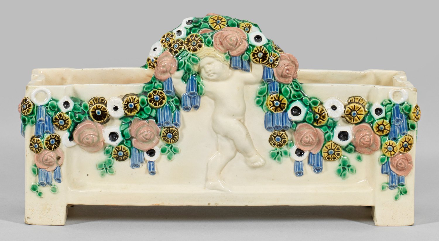 Steingut. Querrechteckige Form mit akzentuierten, pilasterartig gestalteten Ecken. Reliefplastischer Dekor aus zwei Putti beim Tragen einer umlaufenden Blumengirlande. Modell-Nr. 1002, Entw. Michael Powolny zugeschrieben. Firmenmarken der Wiener Keramik und Gmundner Keramik. H. 16,5 cm; B. 30,5 cm.