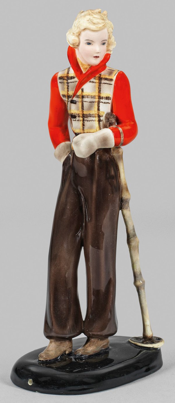 Steingut. Auf einer ovalen Plinthe in legerer Pose stehende, junge Dame in langer Skihose und modischer Jacke, mit dem linken Arm den Skistock haltend, die rechte Hand in der Hosentasche. Farbig bemalt bzw. staffiert. Modell-Nr. 7149. Rest., in der Plinthe zwei kleine Bohrungen. Entw. Stefan Dakon, um 1935. Firmenmarke mit Entw.-Bez. "Dakon" und "MADE IN AUSTRIA". H. 28 cm.