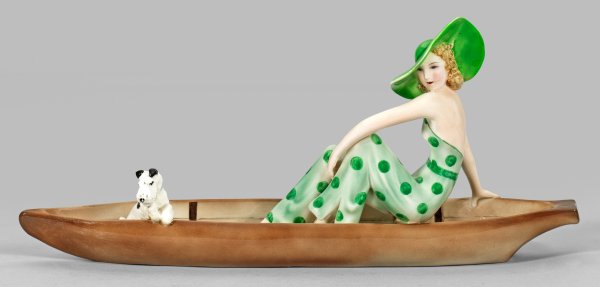A Goldscheider figurine of a fashionable lady with Foxterrier sitting in a boat modelled by Stephan Dakon. Polychrome painted and glazed earthenware. Model-no. 7256. Restored. Inscribed "Dakon", manufacturer's mark with "MADE IN AUSTRIA.