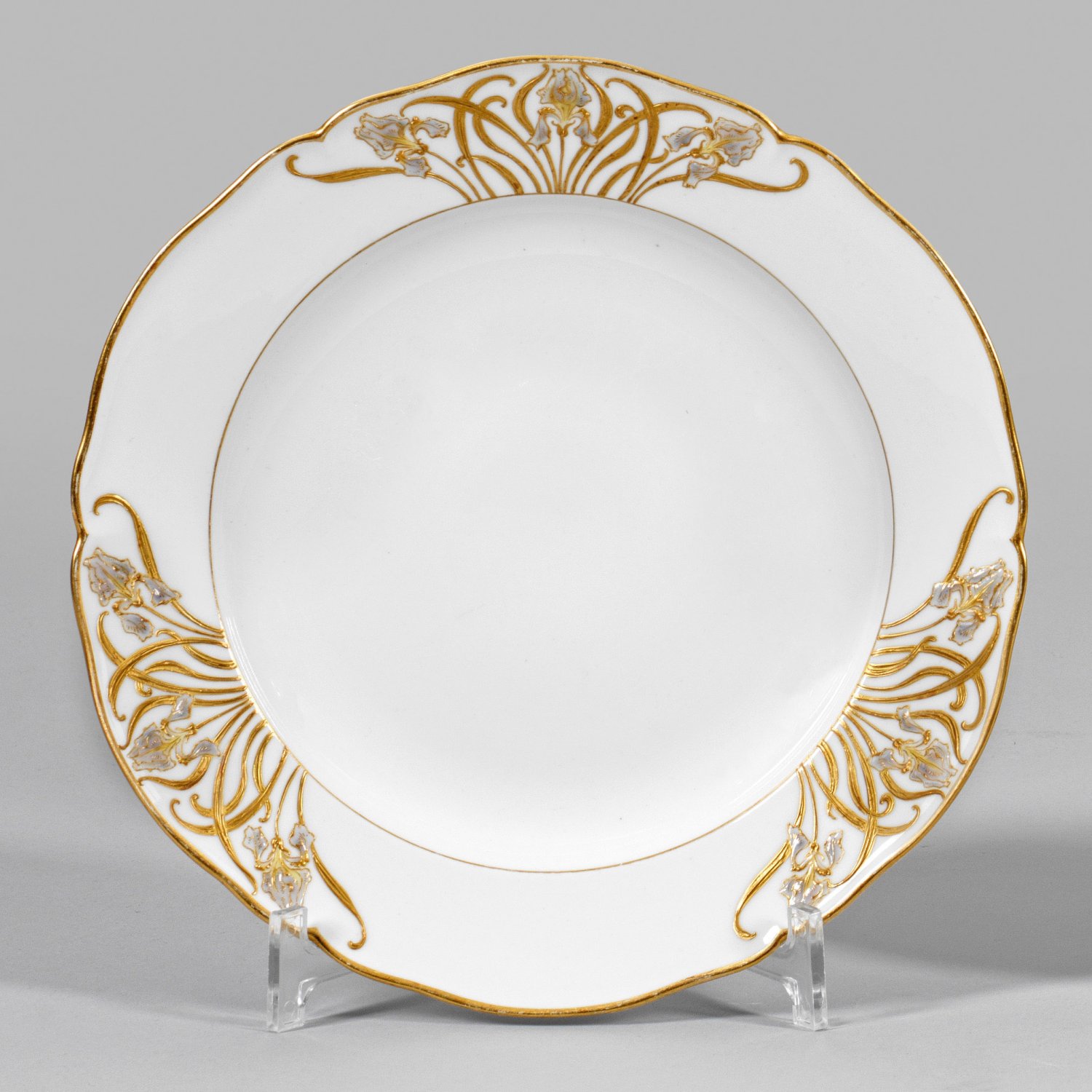 Runde, passige Form. Auf der Fahne dreifaches, axialsymmetrisch gestaltetes Rankenwerk in feinlinigem Reliefgold mit Lilienblüten in farbigen Schmelzperlen, sog. Juwelenporzellan. Polychrome Emailmalerei in Fliederton mit wenig Gelb. Maler-Nr. für Paul (Hermann) Makowitz (tätig in der KPM seit 1891). Zepter- und Malereimarke. D. 24,5 cm.