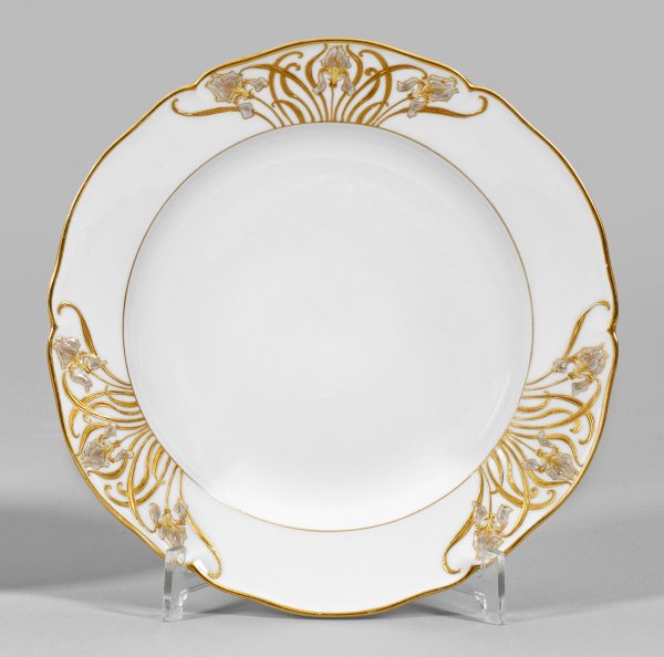 Runde, passige Form. Auf der Fahne dreifaches, axialsymmetrisch gestaltetes Rankenwerk in feinlinigem Reliefgold mit Lilienblüten in farbigen Schmelzperlen, sog. Juwelenporzellan. Polychrome Emailmalerei in Fliederton mit wenig Gelb. Maler-Nr. für Paul (Hermann) Makowitz (tätig in der KPM seit 1891). Zepter- und Malereimarke. D. 24,5 cm.