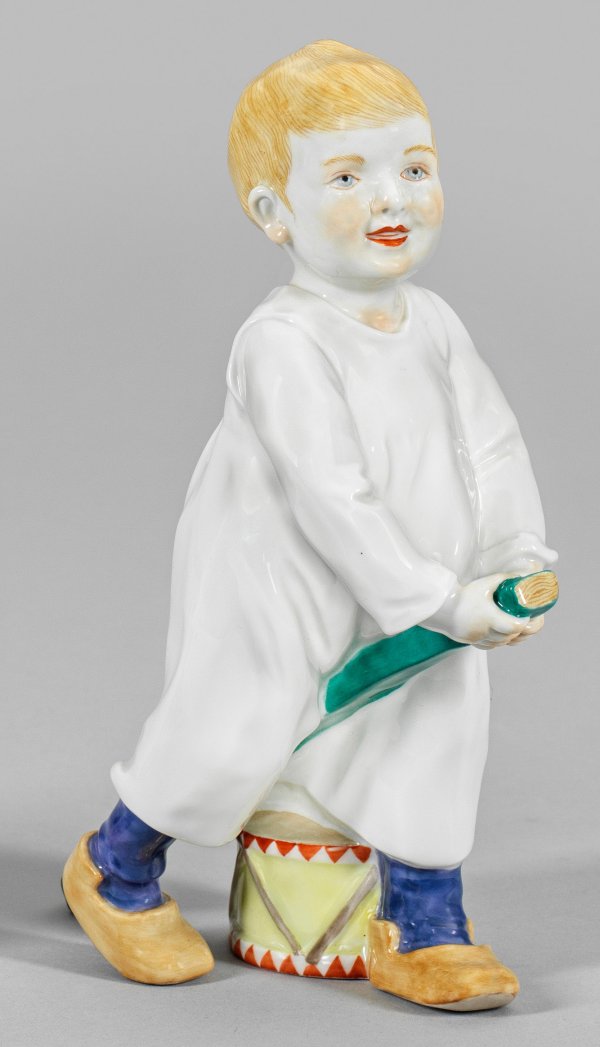 aus der Serie der sog. Hentschelkinder. Kleiner Junge in weißem Hemd, blauen Strümpfen und braunen Pantoffeln mit grünem Stecken. Hinter seinem linken Fuß eine Trommel liegend. Polychrome Aufglasurmalerei. Entw. Konrad Hentschel, 1905. Modell-Nr. 73365. Schwertermarke. H. 19 cm.