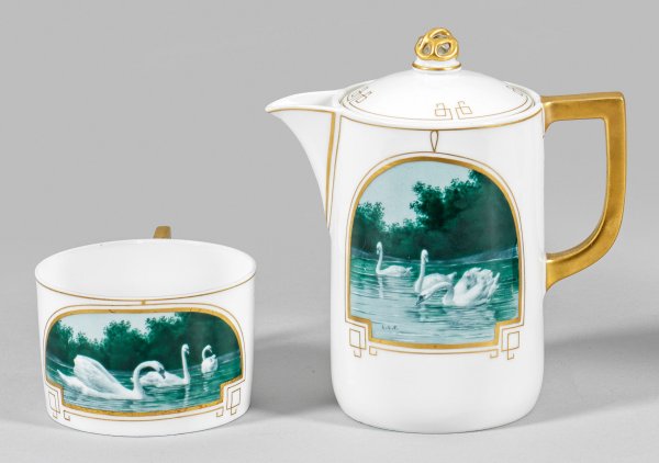 Zylinderform mit J-förmigem, gekantetem Henkel. Auf der Wandung, in goldkonturierter Reserve gerahmte Darstellung eines schwimmenden Schwanenpaares in Grün-Camaieumalerei. Goldstaffage. Form-Entw. Adalbert Niemeyer, um 1906. Dekor-Entw. und Malereiausführung Ludwig Carl Frenzel. Maler-Monogr. "L.C.F." um 1910. Form-Nr. 811. Manufakturmarke. Kannen-H. 14 cm. Tassen-D. 8 cm.