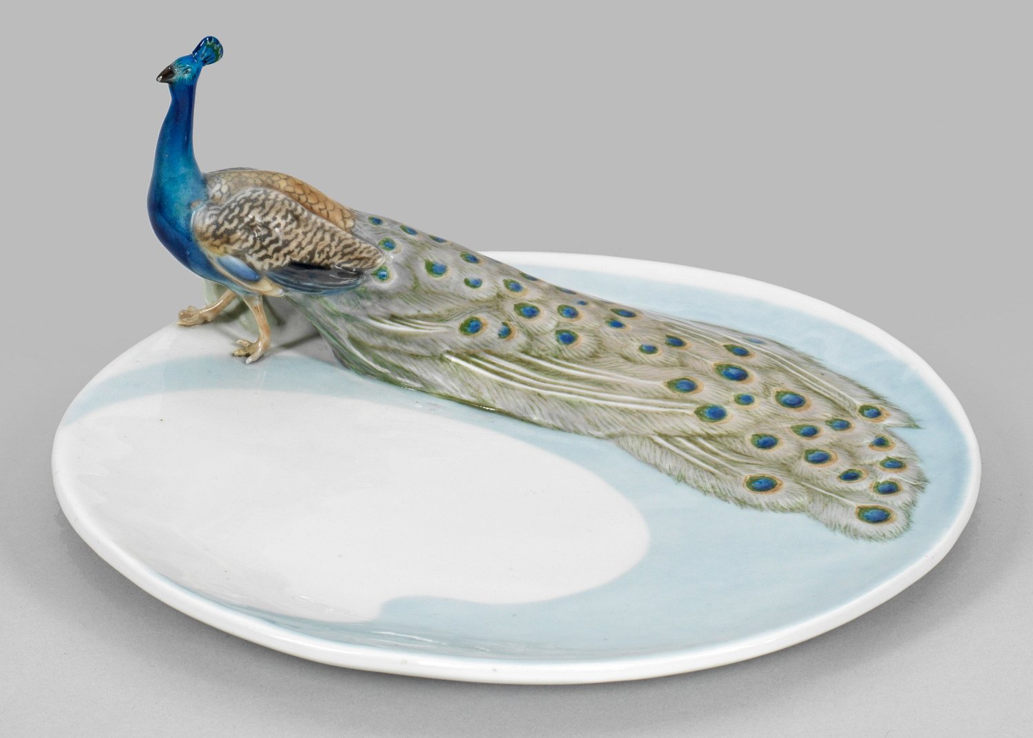 Flache, runde Schalenform mit vollplastischem Pfau. Der lange Schwanz als reliefierter Randdekor auslaufend. Farbenprächtiges Gefieder in polychromer Malerei. Entw. Konrad Hentschel, 1898. Modell-Nr. R 172. Minim. rep.; Schwertermarke. H. 10 cm. D. 21,5 cm.
