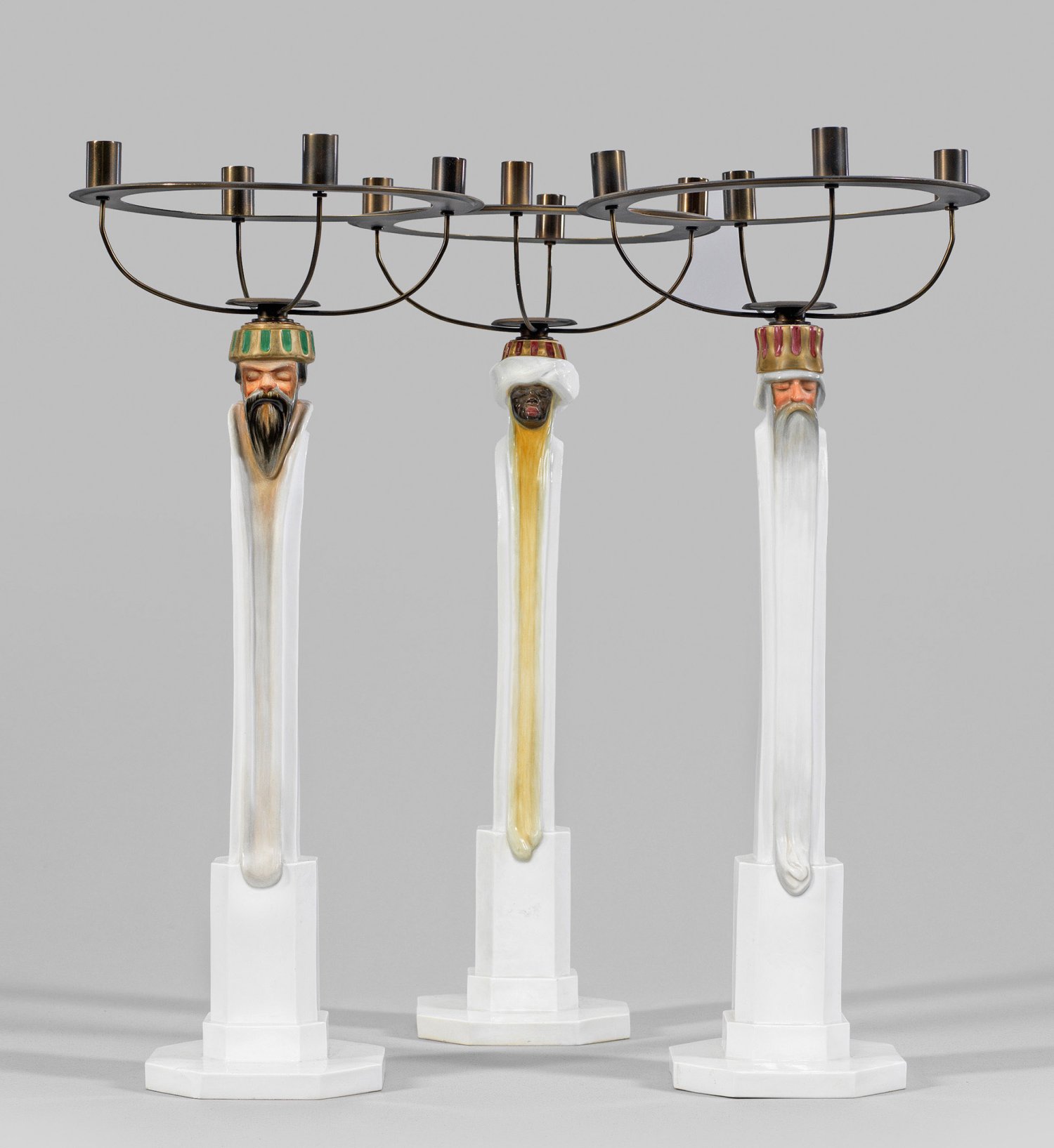 1- bzw. 4-flg.; Auf getrepptem, oktogonalem Postament aufsteigender, schlanker Schaft mit der Büste der langbärtigen Weisen aus dem Morgenland. Kaspar, Melchior und Balthasar mit abnehmbarem, gebogtem, vierflammigem Leuchteraufsatz aus Messing. Polychrome Malerei mit Goldstaffage. Entw. Erich Kleinhempel, 1903. Modell-Nr. T 197. Leuchteraufsatz erg.; Schwertermarke. H. 44 cm - 55 cm.