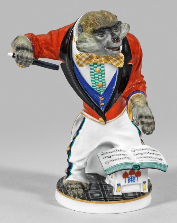 aus der Affenkapelle. Auf runder Plinthe stehender Affe im roten Frack als Dirigent mit Partitur und Taktstock. Polychrome Malerei mit Gold. Entw. Otto Pilz, um 1912. Entw.-Bez.; Modell-Nr. C 271. Schwertermarke. H. 19,5 cm.