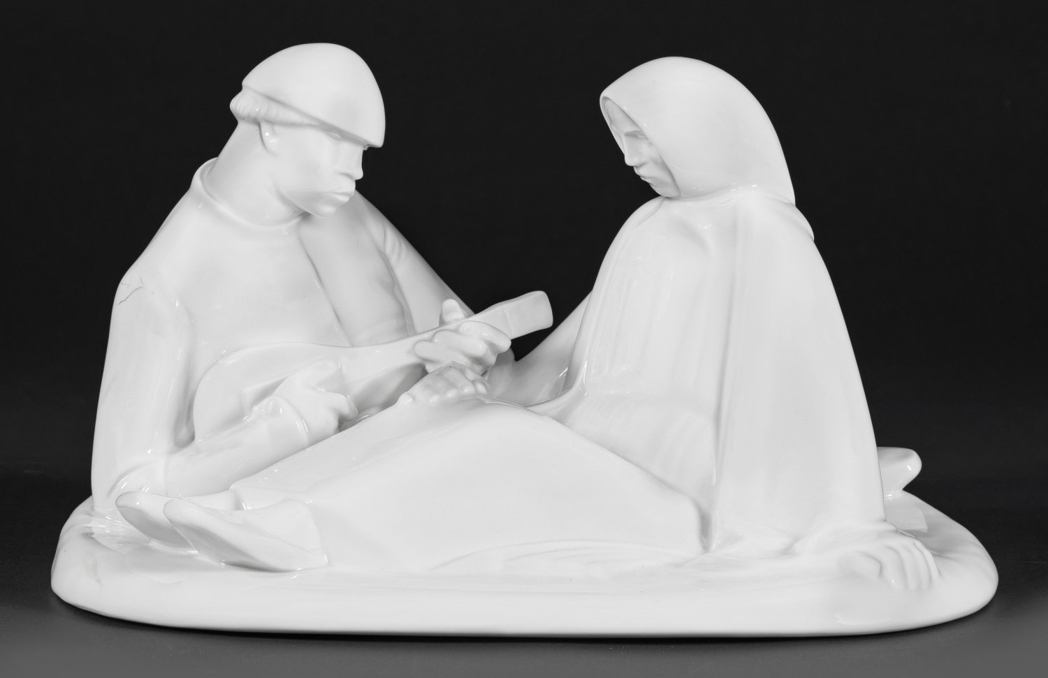 Neuausformung des Jugendstil-Modells der Schwarzburger Werkstätten. Auf unregelmäßiger Plinthe einander gegenübersitzendes, junges, musizierendes Bauernpaar. Elfenbeinfarbenes Porzellan. Entw. Ernst Barlach, 1908. Modell-Nr. U 9. Entw-Bez.; Former-Bez. "Hollosi". Eingepresste Fuchsmarke. H. 21 cm. 37 cm x 28 cm.