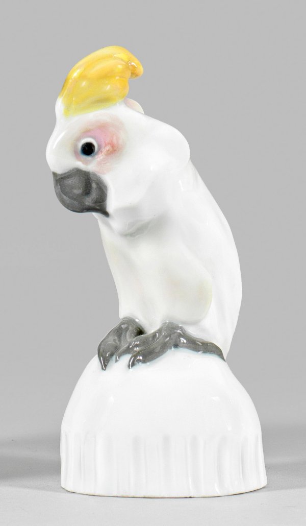 Auf oval aufgewölbtem, teilkanneliertem Sockel sitzender Kakadu mit pastelltonig akzentuiertem Federkleid und gelber Haube. Polychrome Unterglasur- und teilw. Aufglasurmalerei. Entw. Paul Walther, 1909. Modell-Nr. A 208. Schwertermarke. H. 11 cm.