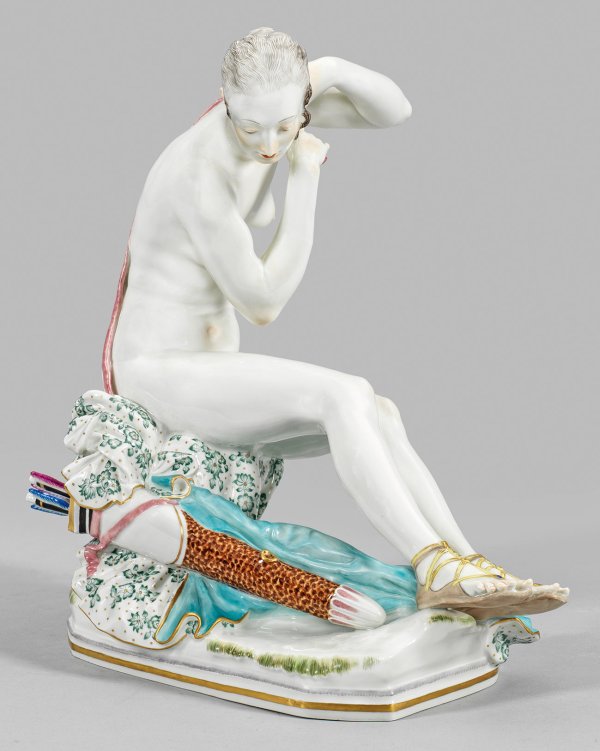 Über rechteckigem Sockel auf einem Fels sitzende, unbekleidete Diana beim Bade mit nach vorn geneigtem Oberkörper und gesenktem Haupt. Das dunkel, fein gestichelte Haar ist mit einem Goldkamm zurückgesteckt. Seitlich liegende, fein aus goldgehöhten Indianischen Blumen gemusterte Kleidung mit hellblauem Innenfutter sowie abgelegter, mit Pfeilen gefüllter Köcher. An den Füßen Sandalen tragend. Zarttonig staffiertes Inkarnat. Polychrome pastellfarben akzentuierte Malerei mit Gold. Entw. Paul Scheurich, um 1920/21. Modell-Nr. A 1046. Schwertermarke. H. 31 cm.