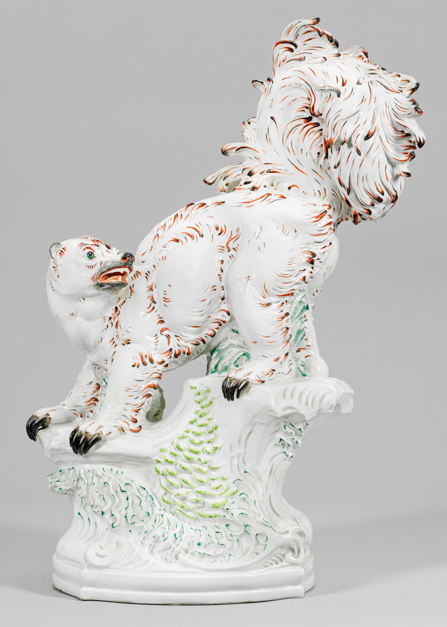 Hoher, unterschiedlich bewachsener Baumstamm, in zwei Ebenen stehender Baummarder mit geöffnetem Maul und spitzen Zähnen, dem Betrachter zugewandt. Farbkräftige, polychrome Aufglasurmalerei. Entw. Hugo Meisel. Ligiertes Künstler-Monogr. "HM"; Manufakturmarke. H. 82 cm.