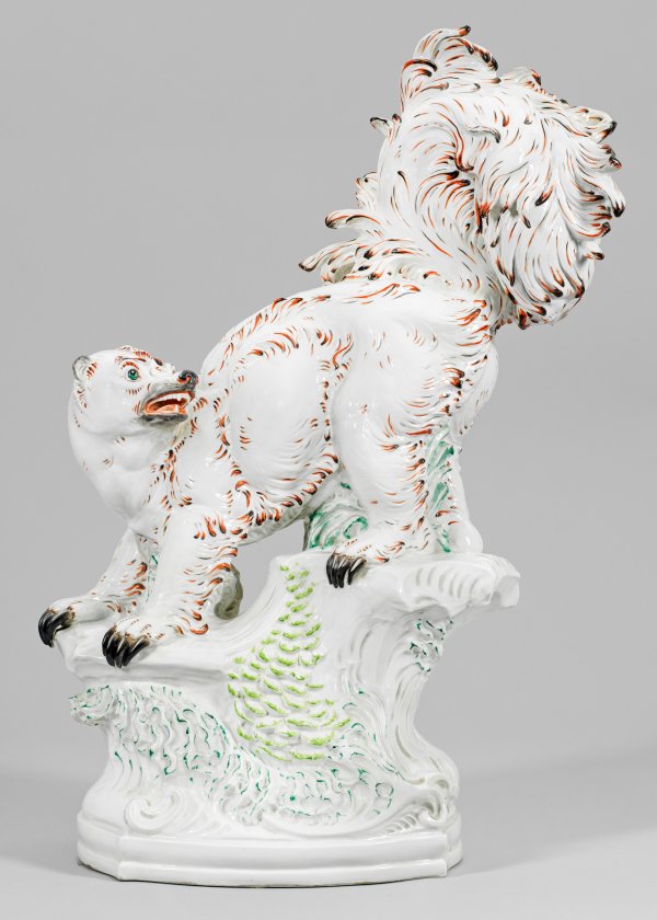 A rare monumental Thuringian porcelain figure of a European pine marten modelled by H. Meisel. Manufacturer's mark.