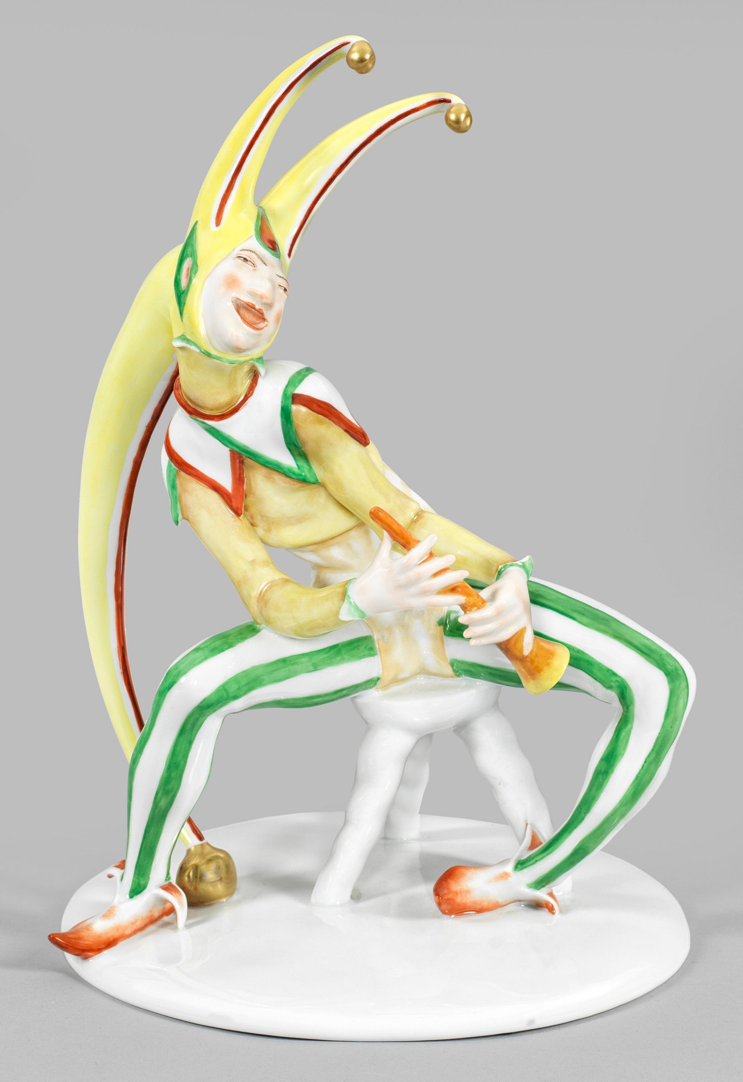 Neuausformung eines Art Déco-Modells der Schwarzburger Werkstätten. Über leicht gewölbter Rundplinthe, auf einem Dreibein-Hocker sitzender Narr in ausdrucksstarker Pose im typischen Narrenkostüm. Polychrome Malerei mit wenig Gold. Entw. Mauritius Pfeiffer, um 1920. Undeutl. Künstler-Bez.; Modell-Nr. 306. Former-Bez. "Hollosi". Eingepresste Fuchs- und unterglasurblaue Manufakturmarke. H. 33 cm.