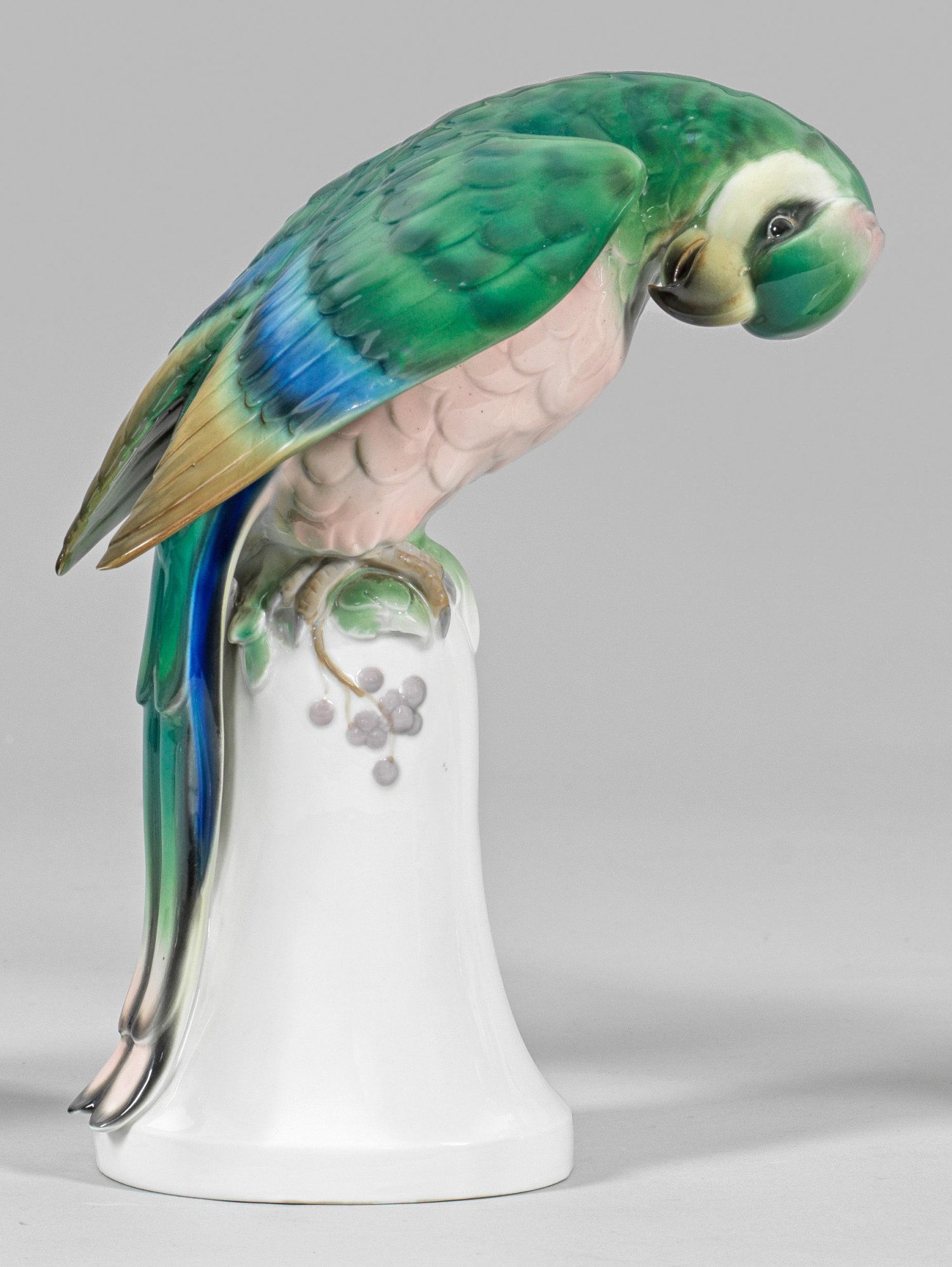 Auf hohem, stilisiertem Baumstumpfsockel sitzender Papagei mit gesenktem Haupt. Leicht reliefiertes, farbenprächtiges Gefieder. Polychrome Unterglasurmalerei. Minim. best.; Manufakturmarke. H. 28 cm.