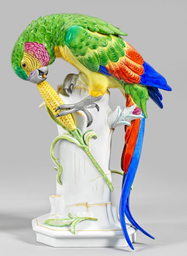 Neuausformung eines Art Déco-Modells der Schwarzburger Werkstätten. Über achtfach gekantetem Sockel, auf stilisiertem Baumstumpf sitzender, farbenprächtiger Papagei beim Fressen eines Maiskolbens. Polychrome Aufglasurmalerei. Entw. Arthur Storch, um 1923/24. Entw.-Monogr. mit Dat. (19)24. Modell-Nr. 1310. Former-Bez. "Hollosi" sowie "Si" in Aufglasurblau. Eingepresste Fuchsmarke. H. 42 cm.