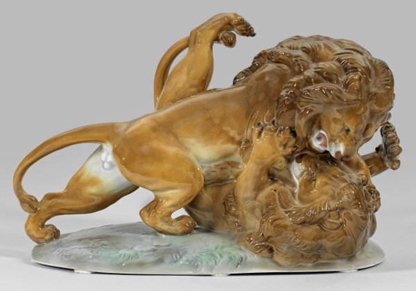 A Saxon porcelain figure group of fighting lions. Restored. Manufacturer's mark.