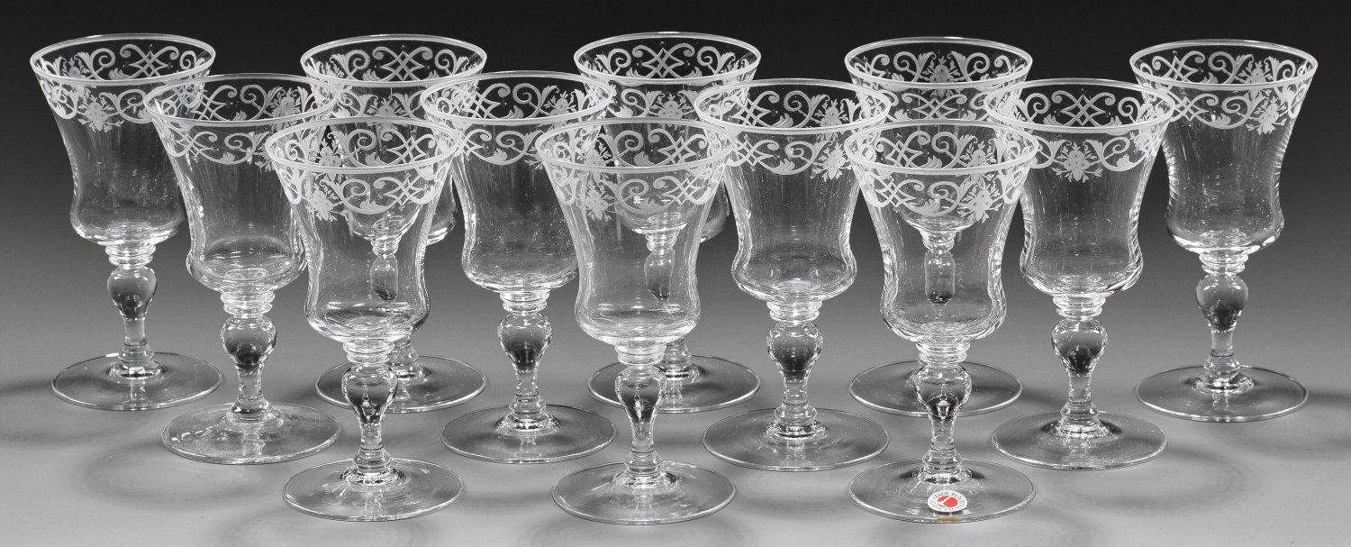Twelve Lobmeyr engraved crystal wine glasses from the drinking set no. 231 "Barock". Each marked with engraved Lobmeyr monogram, one glass with Lobmeyr paper label.