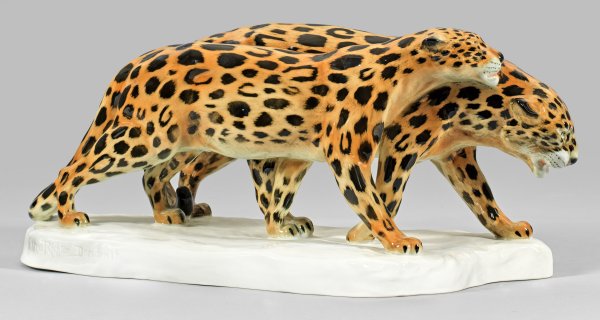 Neuausformung des Jugendstil-Modells der Schwarzburger Werkstätten. Auf unregelmäßigem Natursockel nebeneinander laufendes Leopardenpaar. Polychrome Unterglasurbemalung. Entw. Etha Richter, 1914. Modell-Nr. 1065. Entw.-Bez. mit Ortsangabe Dresden u. Dat. 1914. Fuchs- und Manufakturmarke. H. 22. L. 49 cm.