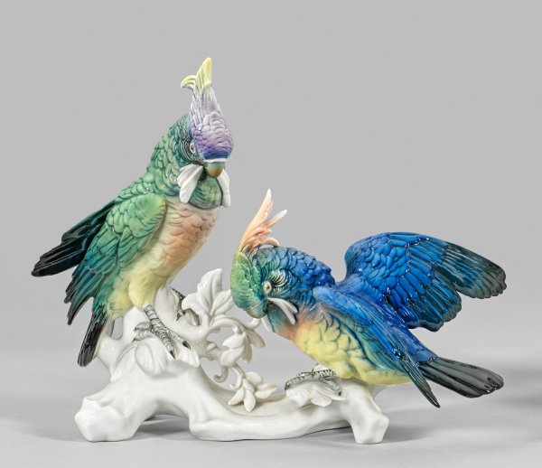 Auf stilisiertem Astsockel sitzendes Kakadupaar mit reliefiertem, farbenprächtigem Gefieder in polychromer Unterglasurmalerei. Modell-Nr. 7336. Manufakturmarke. H. 27 cm. L. 36 cm.