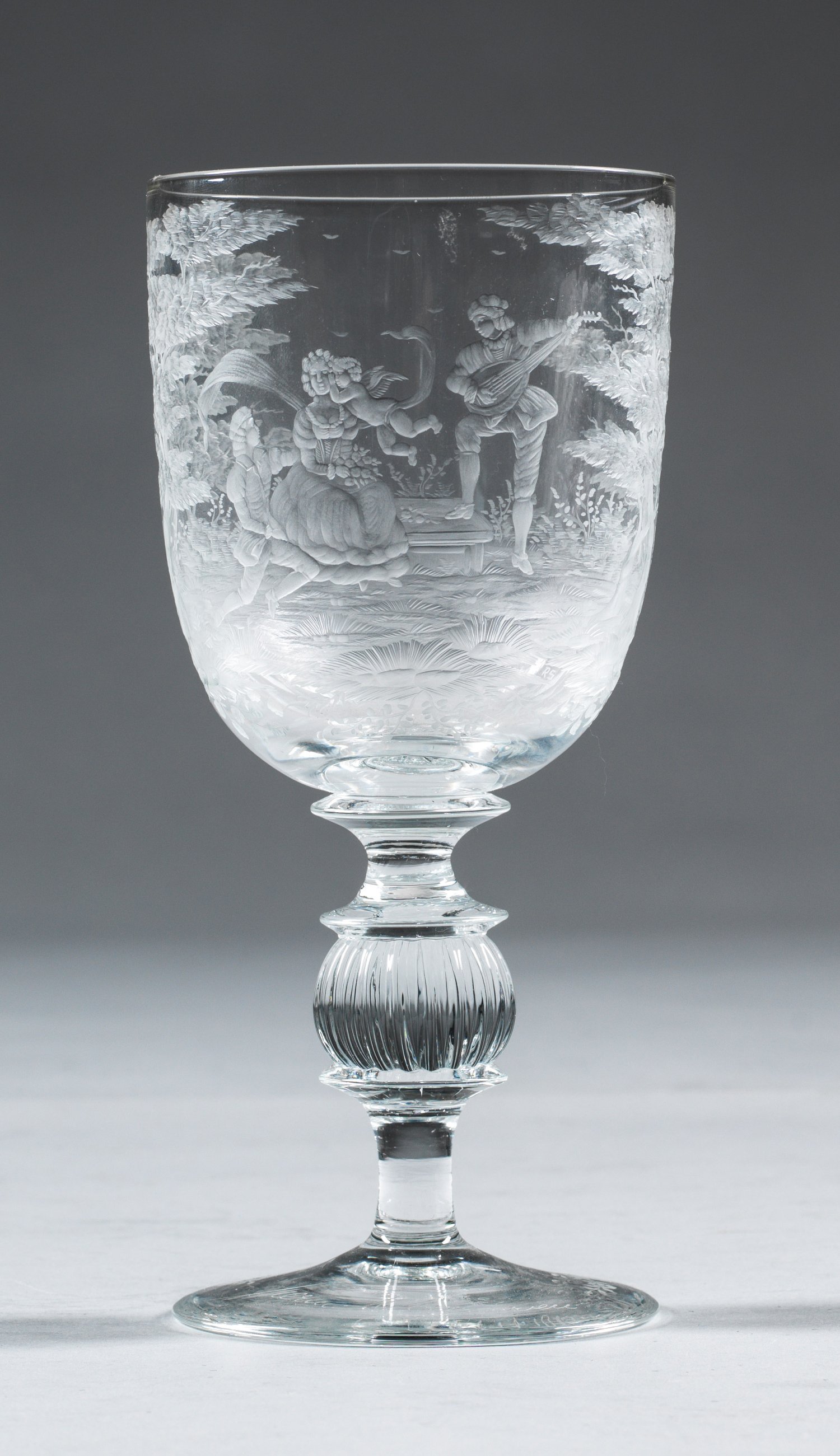 Farbloses Kristallglas. Scheibenfuß, Balusterschaft mit godroniertem Kugelnodus, ovoide Kuppa. Fein geschnittener Dekor mit sitzender Dame und Amor, umworben von einem Galant und einem Lautenspieler. Monogramm "RS" u. dat. 1977, am Fuß Dedikation. H. 20,5 cm.