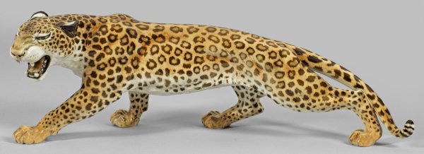 Vollplastische, bewegte Darstellung eines fauchenden, sich anpirschenden Leoparden mit naturalistischer Fellzeichnung. Farbige Unterglasurmalerei in Beige und unterschiedlichen Brauntönen. Entw. Gunther Granget. Entw.-Bez.; Manufakturmarke. L. 47 cm.