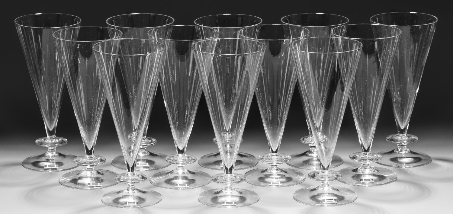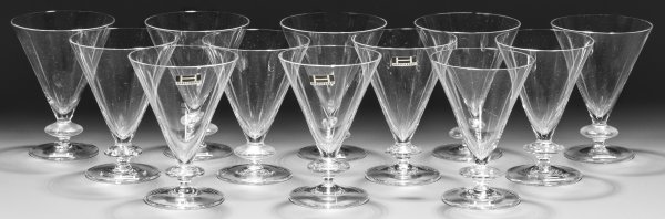 36-tlg.; Farbloses Kristallglas. Flacher Scheibenfuß, kurzer Schaft mit Diskus-Nodus, konische Kuppa. Bestehend aus 12 Sektflöten, 12 Weingläsern und 12 Südwein- oder Sherrygläsern. Größtenteils Firmen-Etikett mit Bez. "HIRSCHBERG". H. 9 cm-17,5 cm.