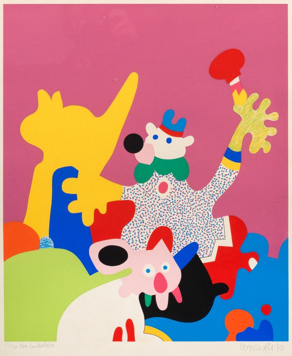 Farbserigraphien/Papier, 1968 und 1970. Jeweils sign. dat. u. betitelt; "Der Zaubergarten (1968) bez. "Probedruck"; "Der Luderbär" (1970) nummeriert 27/30, stockfleckig. Darstellung 32 cm-60,3 cm x 30,5 cm-51 cm. Rahmen.