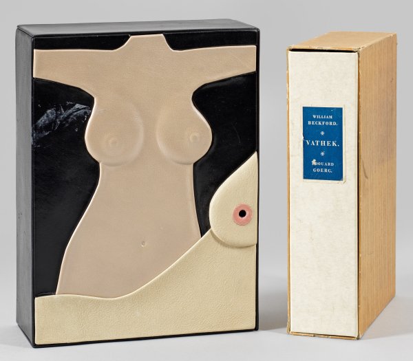 Individuell kunstvoll angefertigter Schuber mit abnehmbarem Seitendeckel aus farbigem und schwarzem Leder, reliefartig verziert mit zwei weiblichen Akten, gefüttert mit goldmetallicfarbenem Leder; schauseitig in die Mitte der rechten Brustwarze einschiebbarer roter Stift zur Befestigung. Schuber-Maße 28,5 cm x 21 cm x 8,3 cm. Im Schuber untergebracht: William Beckford "Vathek", illustriert von Édouard Goerg, erschienen in Paris 1962, eins von 500 Exemplaren (Gesamtauflage 850); lose Blätter im Original-Umschlag sowie im Kartondeckel und Kartonschuber. 27 cm x 17,5 cm x 7 cm. Exlibris von John Hunov auf dem Innendeckel. Leichte Alters- und Gebrauchsspuren.