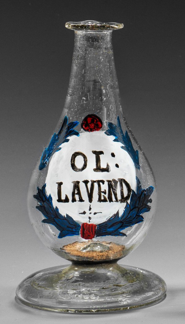 Graustichiges Glas. Birnförmiges Fläschchen auf abgesetztem, weit ausgestelltem Scheibenfuß. Schauseitig ergänzter Dekor aus einer Kartusche mit Inschrift in schwarzer Malerei auf weißem Grund, blau-rote Zweigumrahmung. H. 12,8 cm.