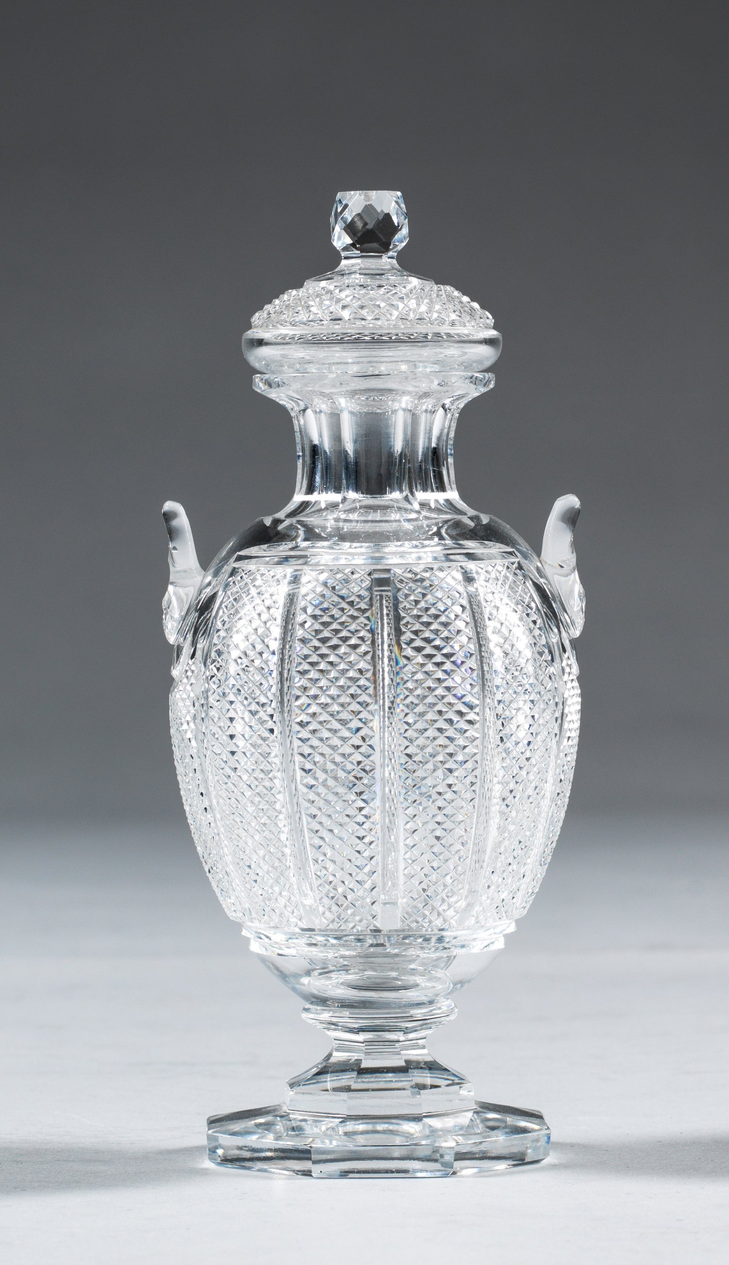 Farbloses Kristallglas. Achteckiger Fuß und kurzer Schaft mit Facetten-Schälschliff, auf dem ovoiden Korpus vertikale Bänder mit feinem Diamant- bzw. Steinelschliff, seitlich zwei kleine, muschelartige Applikationen, facettierter Hals; der leicht gewölbte Deckel korrespondierend mit Diamant- und Facettenschliff. H. 19,5 cm.