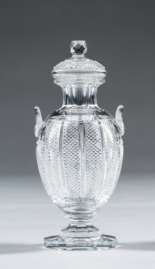 A French probably Baccarat cut crystal glass vase and cover.