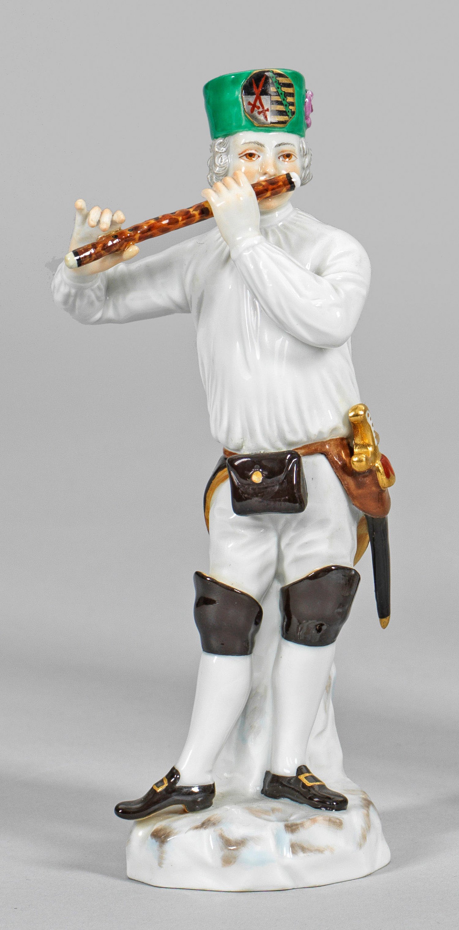 Auf rundem Felssockel stehender Bergmann mit Tscherpertasche, Bergmannskappe mit kurfürstlich-sächsischem Wappen, die Querflöte spielend. Polychrome Malerei. Entw. Ernst August Leuteritz. Modell-Nr. 69542. Minim. rest.; Schwertermarke. H. 16,5 cm.